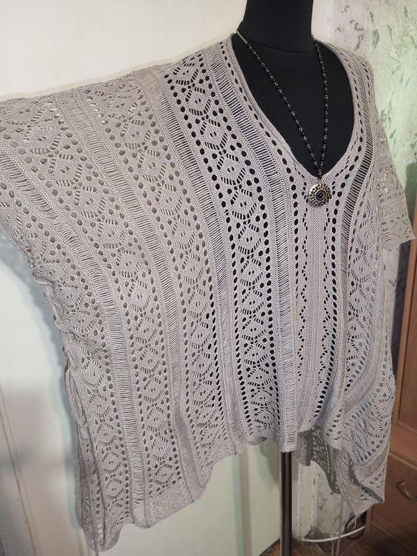 Бохо, трикотажная, ажурной вязки, асимметричная блузка-туника-жилет с шнуровкой по бокам, мега батал или оверсайз. Можно носить на голое тело, на водолазку-гольф, блузку... все зависит от Вашей фантазии. Никаких бирок - нет, легко надевшая на 58-60, за счет шнуровки подойдет и на больший, и на меньший, но ориентируйтесь по условным замерам в плотно зашнурованном виде: длина от плеча спереди (по спинке) - 66/70 см; длина рукава от горловины - 42см; ПОГ - от подмышки до подмышки - 78см + тянется к ПО 130см, ПОТ -81/127см; ПОБ - 88/127см; ПО по канту - 95см+ тянется + по бокам разрезы. Без катышков, мягкая и приятная. См. пр. объявления: есть аналогичные кардиганы-накидки-жилеты, пиджаки и 90% одежды большого размера. Девочки, пожалуйста, переспрашивайте: сложи дополнительные замеры и фото, возврата нет, объявления платни. Подписывайтесь - ежедневно обновление одеждой больших размеров и не только. Покупая несколько товаров - Вы экономите на пересилении, лови комбинируются. Просьба: перед покупкой ознакомиться с рубриком «ПРО МЕНЕ» Состав: бирок - нет, на ощупь - присутствие натуральной нити, приятная к телу Доставка: Перешлю в другой город при полной оплате на карточку