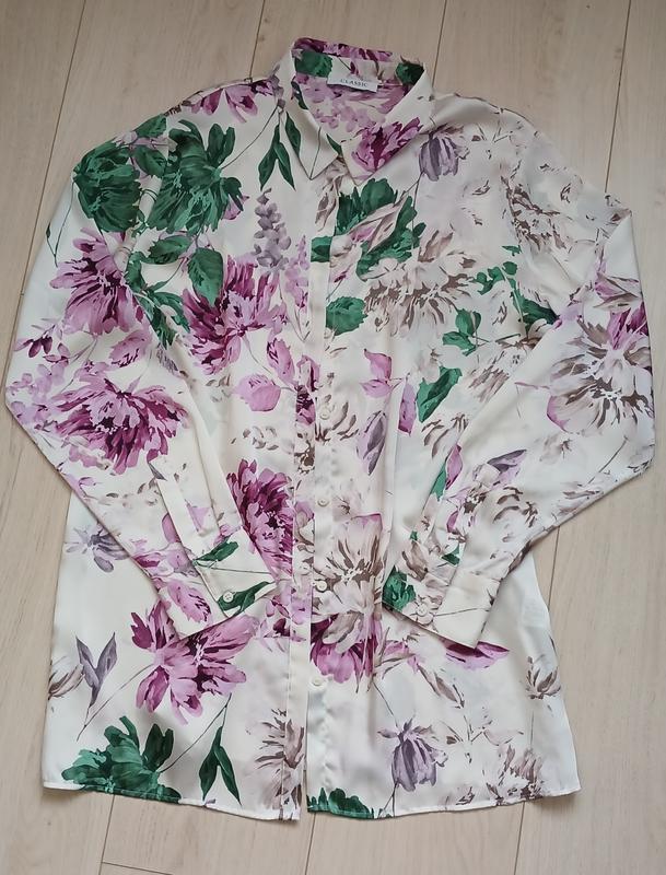 Блузка удлиненная с длинными рукавами в цветочный принт. Прямой свободный крой, рукава на манжетах. Нова. Шелковистая приятная ткань Замеры: Длина 74 от проймы до проймы 52 по стегнах 55 рукав 60