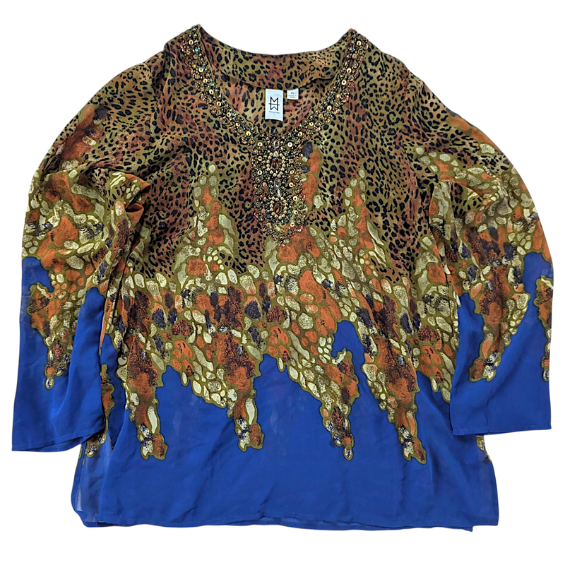 Marc bouwer яркая винтажная шифоновая boho блуза с леопардовым принтом и декорированным вы...