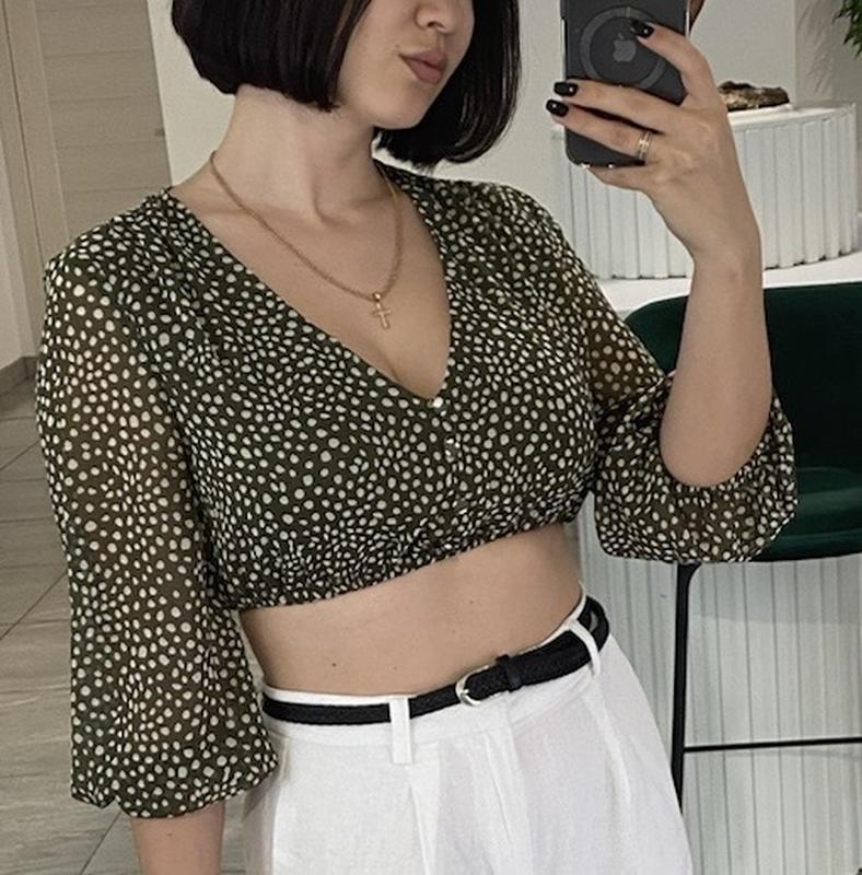 Вкорочена блуза з напівпрозорою тканиною, спереду щільна підкладка, яка не просвічує! На фото одягнено на ріст 163см, обʼєм грудей- 92 см. На менший обʼєм грудей буде чудово!