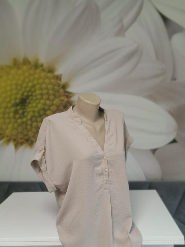 Классическая однотонная блузочка с коротким рукавом светло бежевого цвета. Легкая и комфортная. Приятная на ощупь. Плотная плотная ткань. Практически не тянется. Ложится свободно. Аккуратный вырез Есть размеры. 52р на пог-56-58 50р на пог-54-56