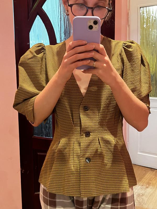 Блуза на короткий рукав-ліхтарик у клітинку гірчично-чорному кольорі. Із ґудзиками спереду чорного кольору із жовтим відливом. У талії приталене. Розмір XS. Стан 5/5, ідеальний.