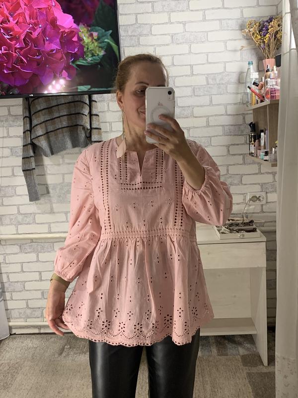 Ніжна рожева блузочка оздоблена вишивкою рішельє! Нова, з етикеткою! Красива, витончена, романтична! 100% котон Розмір XL Плечі 40, по грудях 52, талія 52, стегна 67, рукав 46, довжина 66 см
