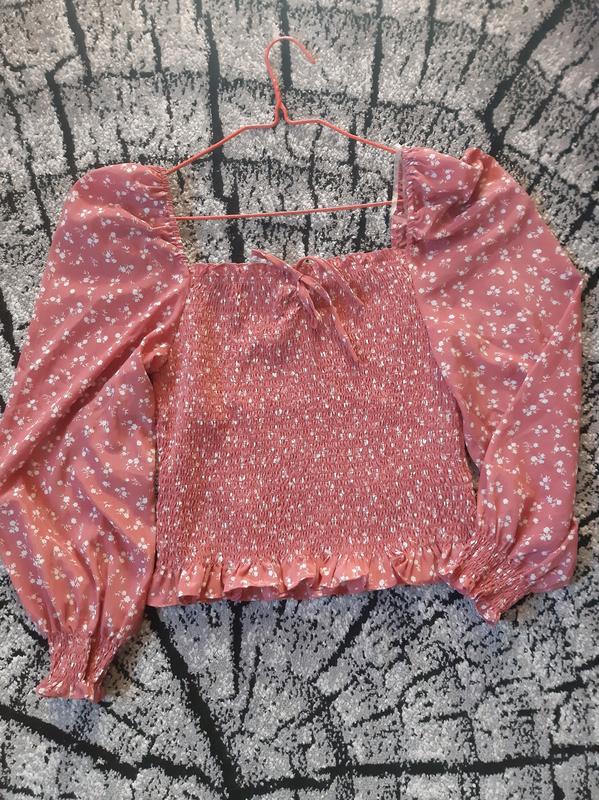 Женская блузка с длинными рукавами, собранная на груди и с цветочным узором. Ткань очень нежная, приятная.