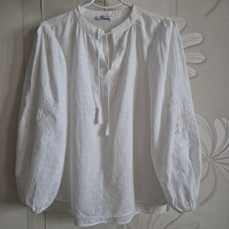 Белая хлопковая блуза с рукавами пуфами. На рукавах очень красивая вышивка. Заміри на фото. Стан замечательный, одевалась несколько раз