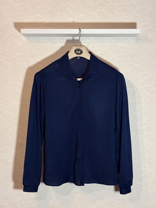 Дуже гарна елегантна жіноча блуза. Не мнеться. Глибокого темно-синього кольору. 48 розмір, але вільний крій, тож буде добре як на менший так і на більший розміри. Довжина рукава - 63 см, ширина в плечах - 43 см.