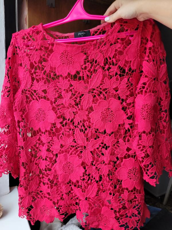 Кружевная розового цвета кофточка, с рукавом 3/4. Длина рукава от плеча 45 см, длина изделия 65 см, ширина по низу 55 см, и груди 49 см. Есть недостаток, указан на последнем фото.