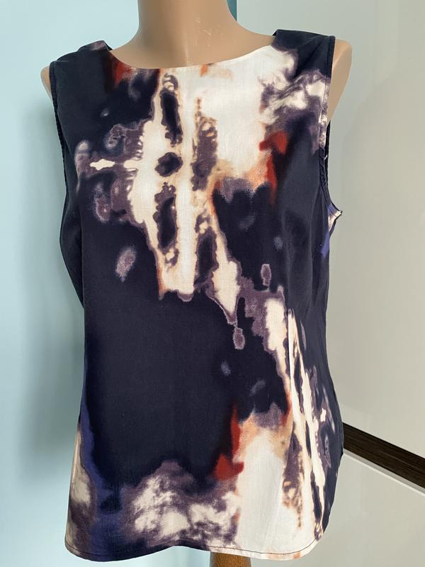 Жіноча блуза без рукавів, дуже цікавий малюнок. Дивиться дуже стильно. НОГ 51 см, НОТ 58, НОБ 54 см. Довжина 60 см. Тканина 98% бавовна, 2% еластан.