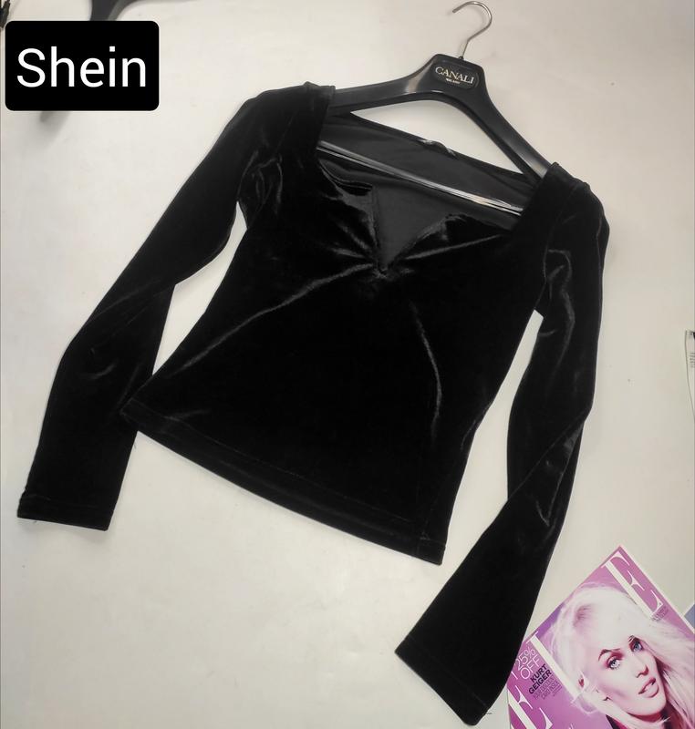 Блуза женская черная бархатная с v-образным декольте от бренда shein m