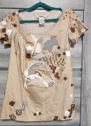 Блузка з короткими рукавами, прикрашена вишивкою та блискітками. Довжина 66, напівоб'єм грудей 45