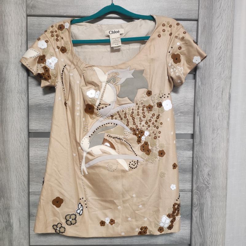 Блузка с короткими рукавами, украшена вышивкой и блестками. Длина 66, полуобъем груди 45