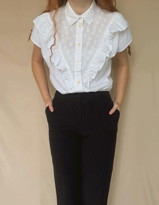 Біла блуза з рюшами та коміром 🤍 ✨Стан дуже хороший (і дрібні цяточки на тканині) 👒Розмір на бірці не вказаний, підійде від S до XL 🪡65% поліестер, 35% бавовна 🧚🏻♀️Заміри: Довжина виробу 59 Обхват грудей 104-110 Обхват талії 94