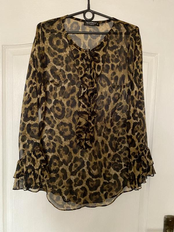 Нарядна жіночка блузка з леопардовим прінтом. По переду і на рукавах з воланами і оборками. Стан нової. Розмір 36/S/44 38/L/46