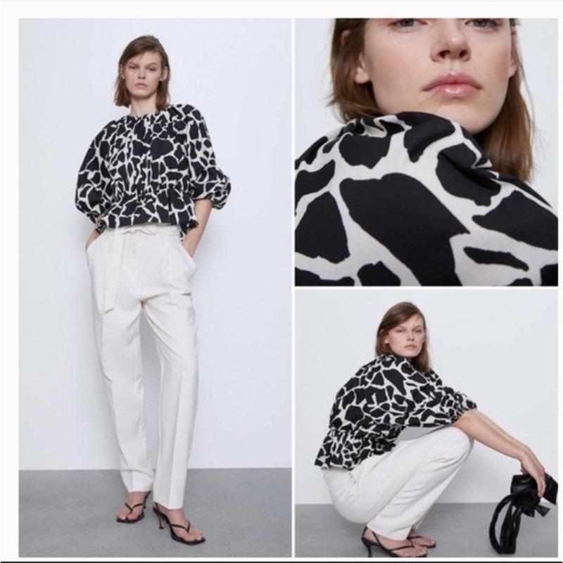Блузка з V-подібним вирізом і короткими обʼємними рукавами. Зборки на талії, розкльошений низ. Натуральна тканина — 100% бавовна. Розмір: XS