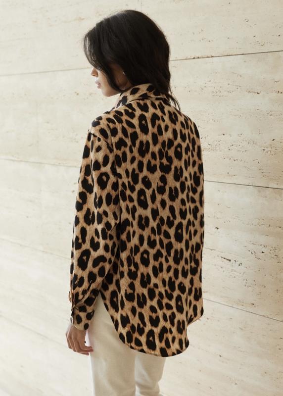 Продам сорочку вільного крою з леопардовим принтом, коміром, застібкою на ґудзики спереду, довгими рукавами з манжетами на ґудзиках, атласною текстурою та вигнутим низом.