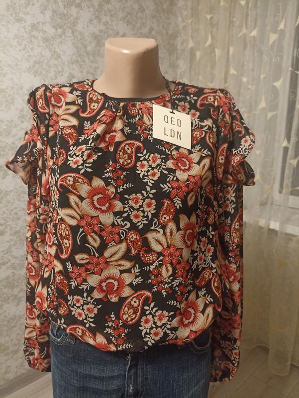 ПОГ 52 см, ПОБЕГ 64 см, Длина изделия перед 65 см, сзади 70 см. Блуза на подкладке, ткань шифон, очень приятная на ощупь, плеча открыть и обшитая воланом