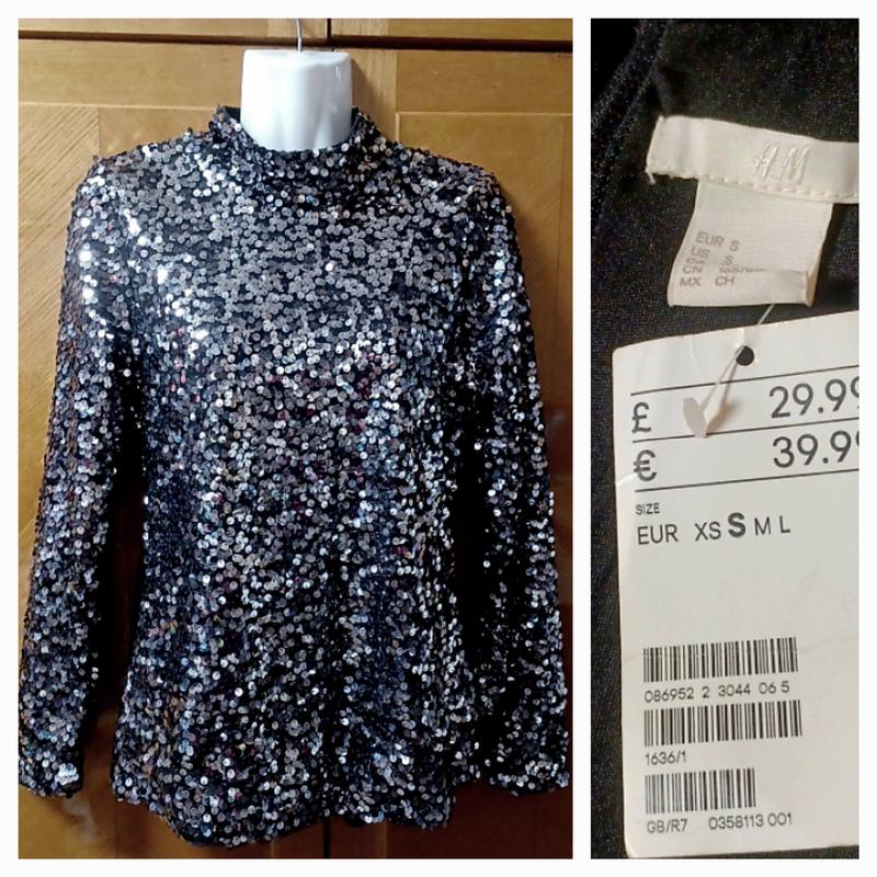 *10 619* Праздничная, блестящая блуза- кофта с бумажной бирочкой от бренда H&M. Верх - сеточка, расшитая серебристыми пайетками. В середине подкладка. Воротник стойка. Сзади застежка молния. На бирочке размер S. ВНИМАЙТЕ ЧИСТИРАЙТЕ ВЫМЕРЫ. Замеры делали с середины. Полуобхват груди 44 см ( тянется до 48 см ), по талии 38 см, по низу 44 см. Воротник высота 5 см. Ширина в плечах позаду 38 см. Рукав длина от плеча 60 см. Высота по спине от плеча у горловины 64 см, от подмышек 40 см, по переду от плеча у горловины 62 см. 100% полиэстер. Фото на теле взято из инета. ❗️НАЛОЖЕННОГО ПЛАТЕЖА- ПРЕДОПЛАТЫ, БЕСПЕЧНОЙ ОПЛАТЫ, ПОВЕРННОСТЬ И ОБМЕНА НЕМЕТ. ❗️Отправляем после полной платы на карточку Приватбанка. ❗️Доставка Новой или Укр по почте за средства покупателя. Можно оформить доставку здесь, с указанием,НА КАРТКА ПРОДАВЦЮ, ❗️Карточку просить только в том случае, когда уверены, что покупаете товар. (141125)