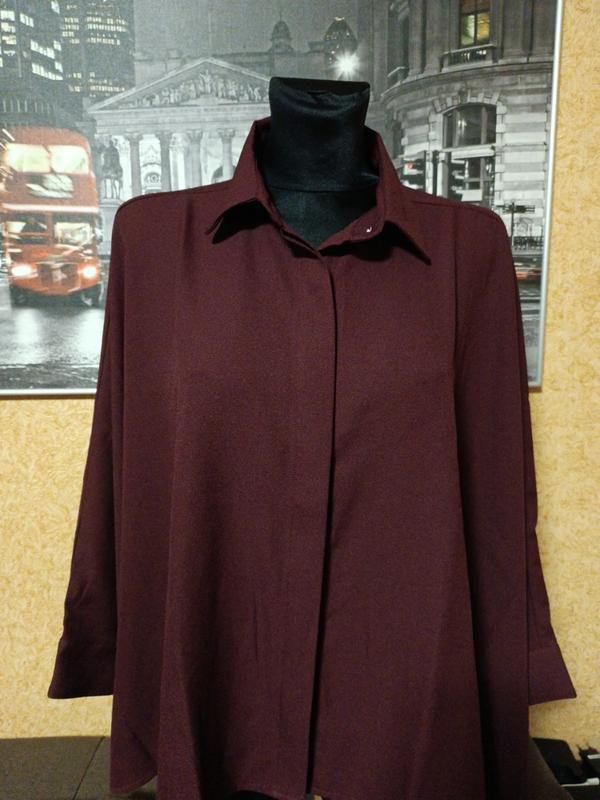 Рубашка женская красивого бордового цвета, свободного фасона, который подойдет на более крупные размеры, хотя указано-S.Застегивается на пуговицы, закрытые планкой, рукав зауженный на манжете. Замеры: ПОГ-102см, длина рукава от горловины-62см, длина-60см.