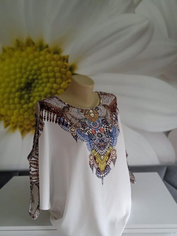 Классическая блузочка с коротким рукавом и оригинальным контрастным рисунком. Легкая и удобная. Приятная к телу. Плотная плотная ткань. Практически не тянется. Ложится по фигуре. Фасон-легкая летающая мышь. По плечам небольшие разрезы. Аккуратный вырез Есть размеры. 54р на пог-58-60 52р на пог-56-58 50р на пог-54-56