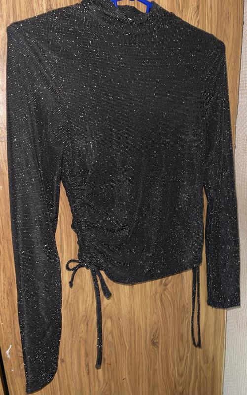 Блузка з довгим рукавом , в ідеальному стані з блискітками , на шнурівці по боках які дають регулювати довжину кофтини . Заміри Груди ( напів обʼєм ) -37 см ( тягнеться ) Довжина - 52 см Рукав - 66 см