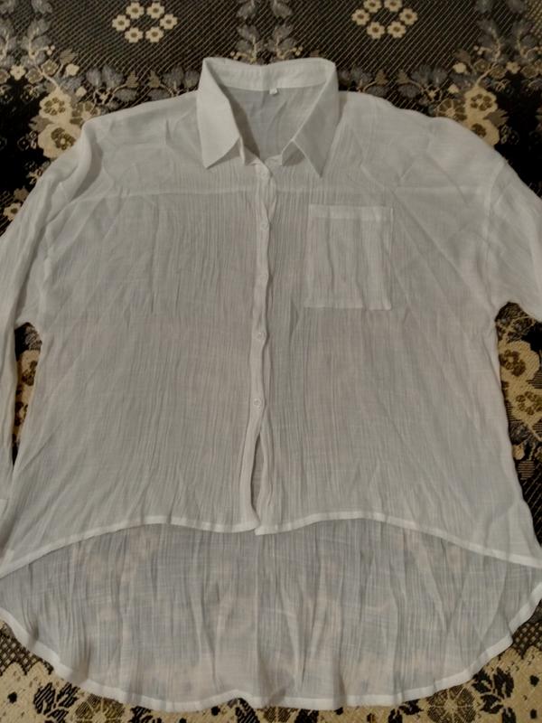 Стильная белая блузка с длинными рукавами и асимметричным низом.