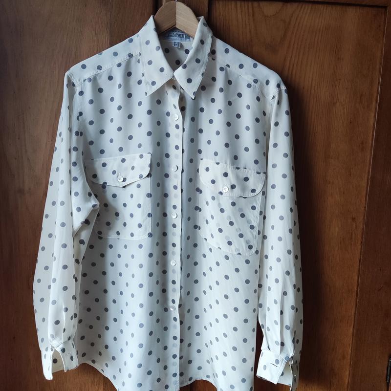 Винтажная блуза из натурального шелка молочного цвета в бежевые горохи. Рукава под запонки. Размер вказано 44 эарро, но пойдет и на больший. Очень хорошее винтажное состояние.. ПОГ-ПОТ- ПОБ 57, плечи 46 (спущенное плечо). Длина 68, спереди и сзади дольше ( полукруглый низ немного), рукав длина 57 см