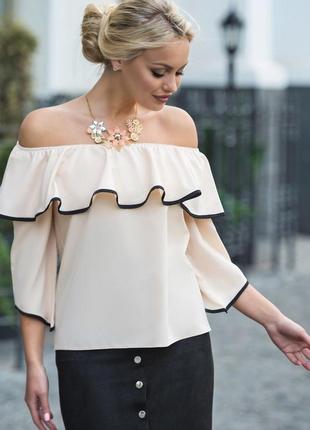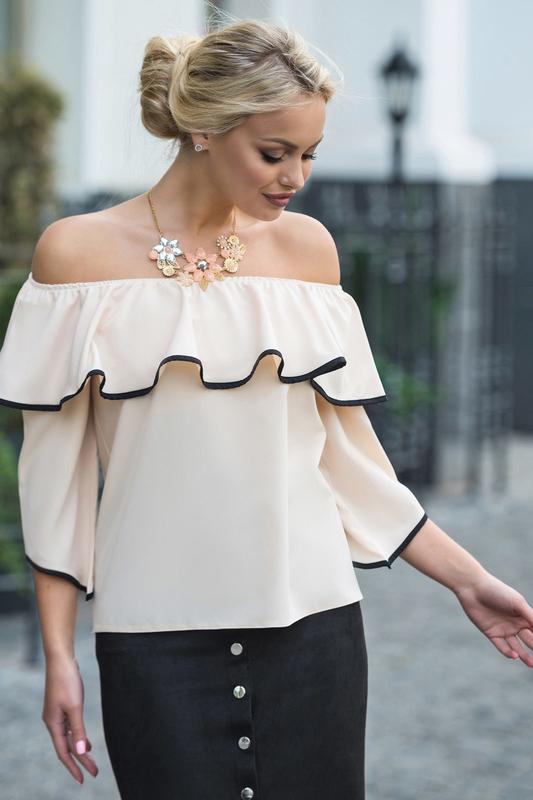 Изящная блузка с воланом Утонченная и изящная блузка с открытыми плечами, идеально подчеркивает эстетичные изгибы. Женская грудь подчеркнута широким воланом, что делает ее визуально больше и привлекательнее. По краям волана и рукавов блуза оформлена темной контрастной каемкой, хотя сама вещь выполнена в нежном женственном оттенке. Состав: 50% вискоза, 50% полиэстер Производитель: Украина. Цвета: белый и молочный. Размер только 46. Замеры изделия в 44 размере: длина по спинке - 50 см; длина рукава (от плечевого шва) – 39 см. Материал: soft. Рост модели: 170 см, параметры: 89х61х92 см. Растяжимость: средняя. Цена распродажи 360грн.