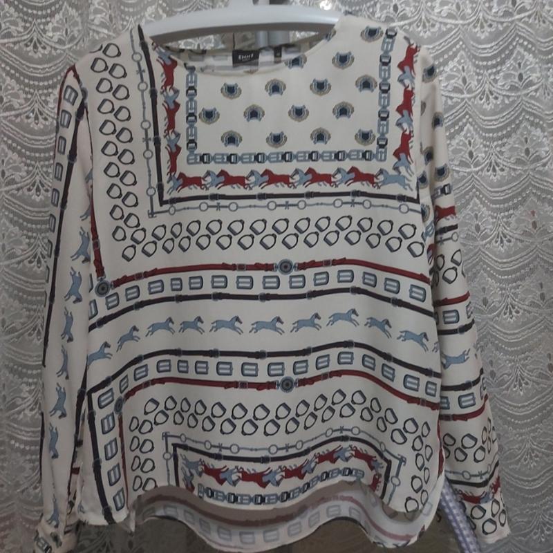 Добавьте описание (до +20%) Описание украинского* Брендовая блуза из твиловой вискозы Еmmе Marella в платочном стиле. Прекрасная вискоза диагонального плетения с принтом в виде лошадок, сбруи, подков накремово-белом фоне.Смотрится дорого и красиво! Тактильно очень приятная. Гладкая и скользящая.Не просвечивается и не тянется Блуза новая, без бумажной этикетки. Состояние идеальное. Marella известный тальянский бренд премиум класса, является частью группы Мах Мага. Итальянский р.46 европейский 40/38/, смотрите по замерам: в груди -58;вталии-58 -59; длина по спинке 64, перед корочена 7см; длинарукава-61; плечо -10: плечевой шов- 43 Оплата на карту Приватбанка. Примерки, возврата нет.