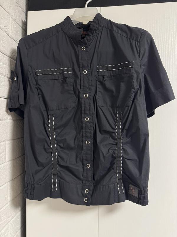 Чорна блуза на кнопках. Комір стійка, дві кишені на блискавках. Резинка понизу. Заміри на фото, на замовлення зроблю додаткові. Не з секонду, ніяких зайвих запахів. Носила мало, стан ідеальний. Можна носити не застібаючи, непогано комбінувати із спортивними речами. Розмір S.