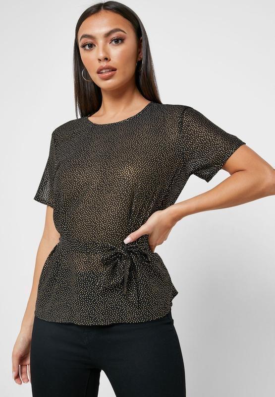 НОВА! Елегантна жіноча блузка Object Collectors Item. Привабливий блискучий принт в золотистий горошок на чорному фоні. Має зав'язки на талії, що дозволяють регулювати крій та підкреслити фігуру. Ідеальний вибір для вечірніх виходів, святкових подій або для додавання блиску до повсякденного образу. • Стан: Нова (з біркою). • Розмір: XS (по бірці EU 34, UK 6). • Склад: 100% поліестер. Заміри: • Плечі: 39 см • Пахви (напівобхват): 46 см • Довжина: 62 см