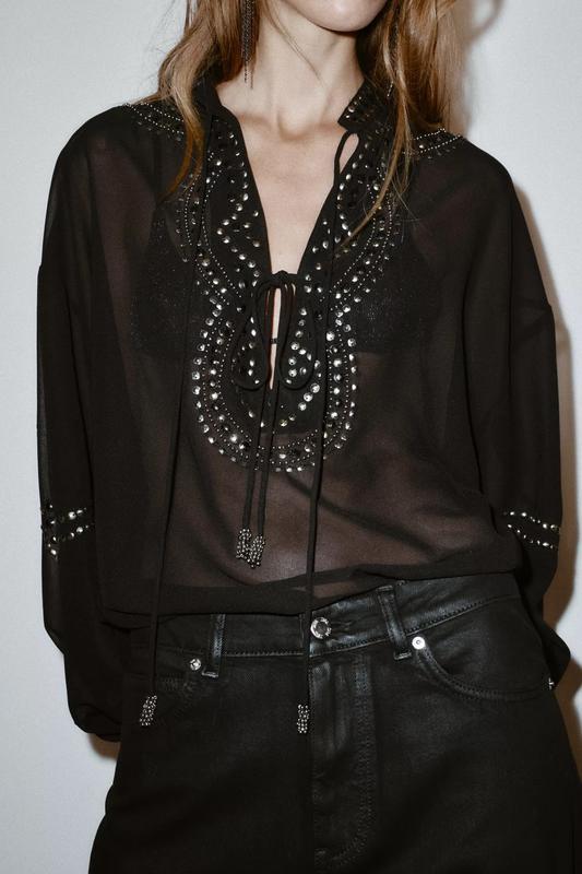 Блуза с высоким воротником и длинными рукавами на манжетах. Полупрозрачная ткань с аппликацией из шипов и бисера. Застежка спереди на завязки.