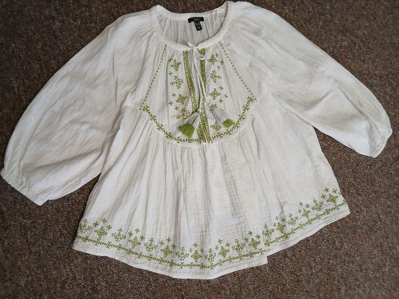 блуза новая без этикетки. ткань мягкая как двойная марлевка-муслин непрозрачная. рукав широкий- пройма занижена. вышивка машинная. реглан-линия реглана-40см под руками-70 пот и поб до 80 см длина-70см длина рукава от шеи-65 см низ рукава на резинке. спинка без вышивки.