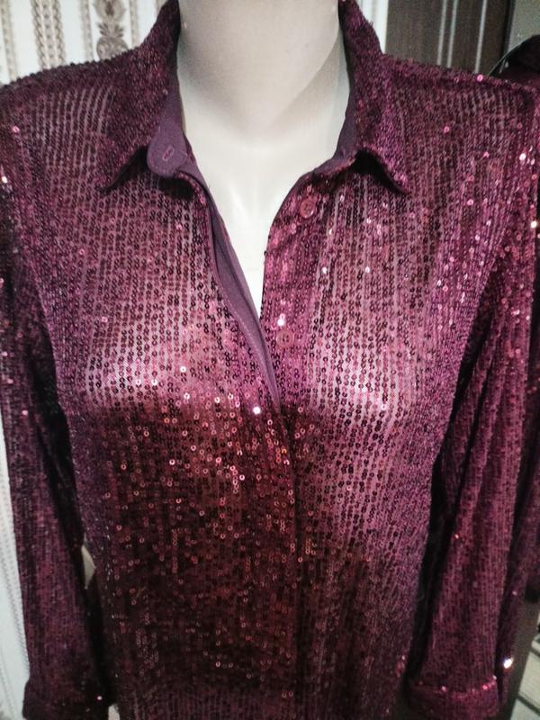 Шикарная блуза-туника удлиненная, цвет темный бургунди. Пошита в виде рубашки. Ткань шифон-паетки. Объем груди до 110 см, длина спереди 73 см, сзади 80 см, рукав 63 см. Подойдет красиво под леггенсы или лосины. Оплата продавцу на карточку.