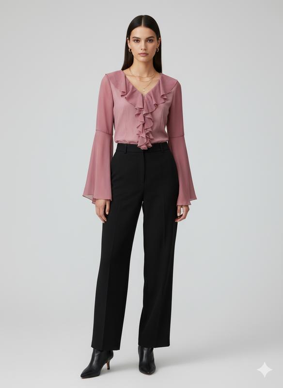 Блуза имеет очень выразительный дизайн: корсетный крой, вертикальные воланы/жегко по центру и широкие рукава-клеш (бабочки"), выполнены из легкой полупрозрачной ткани. Это романтичный, готично-винтажный стиль. Замеры длина 50, обхват в груди 70. Отлично тянется.