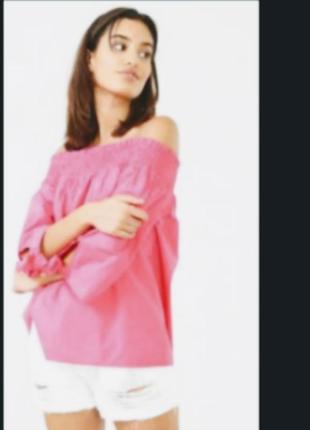 Состояние новой, ткань не тянется.Очень классная блуза свободного кроя со спущенными плечами. Низ рукава на завязочках Идеальная вещь для лета Размер указан 8, подходит на 42, 44, 46 размеры. Замеры: Длина 66 см (по бокам закругленная) Верх резинка 45 см хорошо тянется Рукав 37 см от резинки. Пог 50см, далее расширенная к низу Есть аналогичная , темно-синяя (на М)