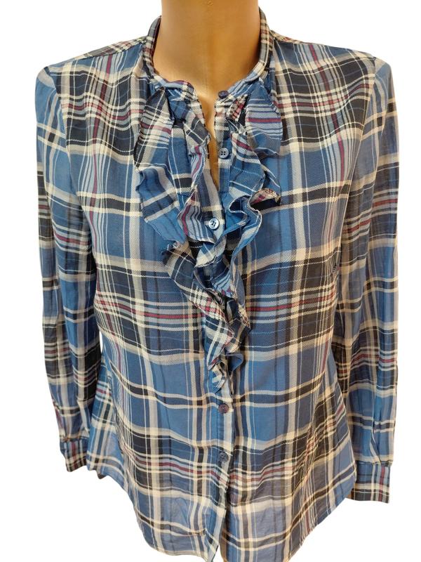 Невесомой блузка от премиальной линейки Autograph. Эксклюзивный микс хлопка (70%) и натурального шелка (30%). Ткань невероятно нежная на ощупь, имеет легкий благородный блик и позволяет коже «дышать». Принт в клетку в сине-голубых тонах с изящными акцентами. Главная особенность – эффектное жабо (рюши) вдоль пуговиц, что добавляет образу женственности и романтизма. Размер: UK 12 (соответствует европейскому M-L / 40). Замеры ПОГ 46+3, длина рукава 59, длина 60, плечи 36
