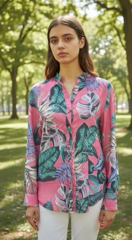 Продается **волшебная льняная блузка с тропическим принтом от немецкого бренда Bianca** - настоящий летний хит для ярких образов! 🌿✨ плечи 38, пог48, пот45, поб50, длина 67, рукав61. **Дизайн**: Насыщенный розовый (fuchsia) фон с крупным принтом - тропические листья монстеры, банановые и пальмовые ветви в зеленых, бирюзовых и фиолетовых тонах. Стойка-мандарин, планка на перламутровых пуговицах, длинные рукава с манжетами – элегантно и стильно. - **Материал**: 100% натуральный лён - дышащий, мягкий, идеальный для жары, с легкой текстурой, придающей шарма. - **Размер**: 36 DE (XS–S, EUR 36) - подойдет на стройную фигуру. - **Стан**: Идеальный! Принт яркий, без повреждений - готова переносить вас в тропики! Это не просто блузка - это **тропическое настроение в гардеробе**: для отпуска, прогулок, свиданий или повседневного стиля. Сочетайте с белыми брюками, джинсами или юбкой – и вы королева лета! Не упустите – такая яркая льняная жемчужина разлетается мгновенно!. Эта красавица ждет именно вас! 🌺❤️