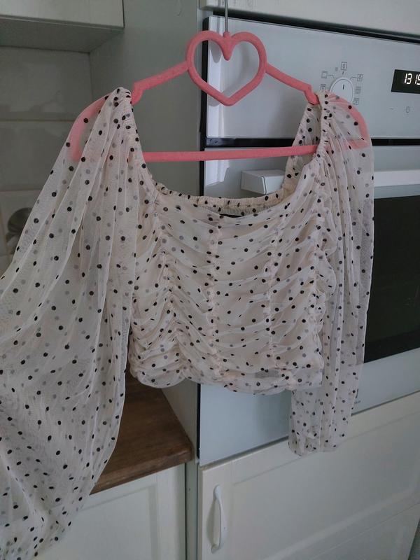 Классная блуза с объемными рукавами, сзади резинка, плечи также резинка можно опустить спущенные плечи, размер хс подойдет и на с