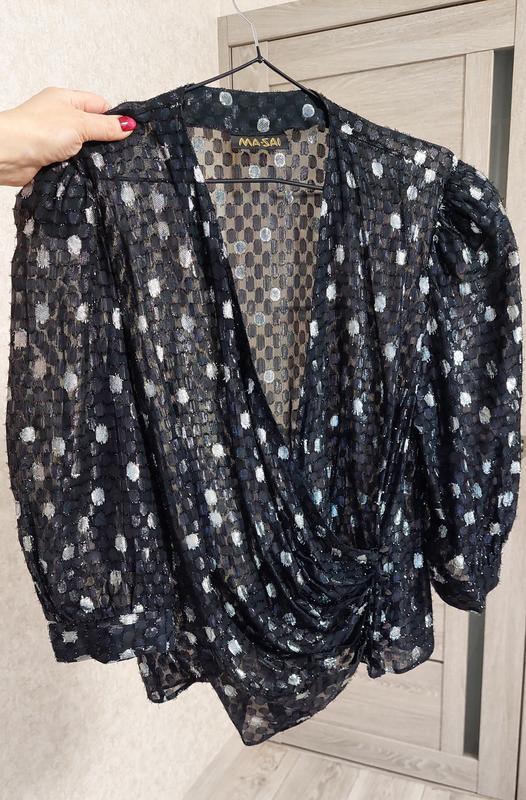 Черная праздничная полупрозрачная блуза в стиле 80-90 лет с блестящим люрексовым принтом,...