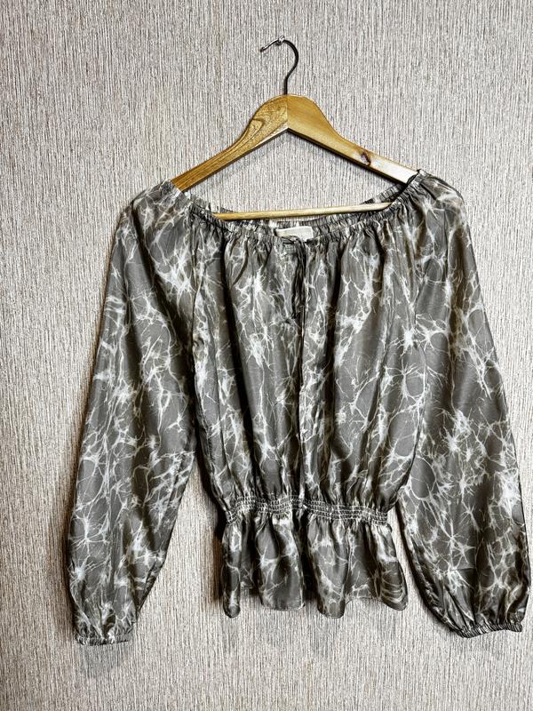 Повітряна шовкова блузка з довгими рукавами та принтом у вигляді сірого мармуру з натурального шовку з баскою Michael Kors Розмір XS Підійде і на S Верх горловина резинка , не стягується Ідеальний стан Довжина спереду від горловини 50 Довжина від плеча 60 Рукав від горловини 66 ПОГ 50 ПО в таліі 25,5 резинки тягнеться до 47