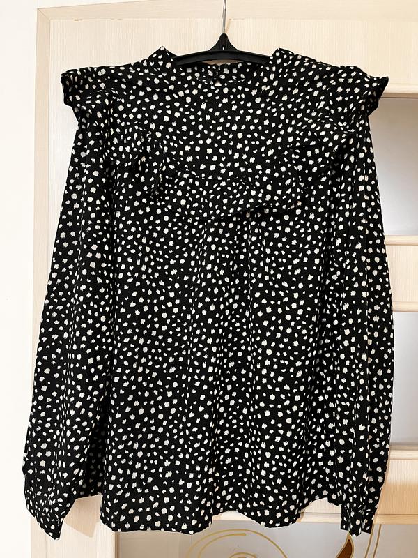 Легка блуза, великого розміру. Довгий рукав на ґудзиках. Вільний крій. Є дефект на тканині(останні два фото), під рюшем, не кидається в очі. Заміри ⬇️ Ног Низ Довж по спинці Довжина рукава від шиї