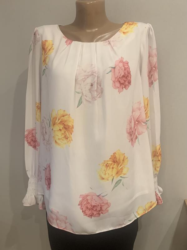 Элегантная нарядная блузка в роскошном нежном принте, на подкладке из стрейчевои трикотажной ткани, манжет рукава присборен на тоненькие резиночки, с воланчиком, горловина эффектно присборена. Очень качественная, ткань приятная, состояние отличное. Пог 58 см, ПО низу 61 см, длина от плеча 64 см, длина по центру спинки 62 см, плечи 40 см, рукав 62 см