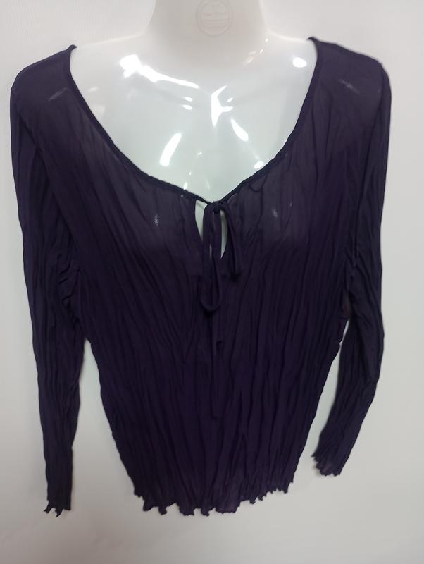 Гарна блуза. Цвет спелой сливы. Жатка. Спереди на завязке. Качество супер! ПОГ-50, тянется -60 ПОТ-40, к-62 ПОБ-38, до -62 Плече -8 Рукав -62 Длина -67
