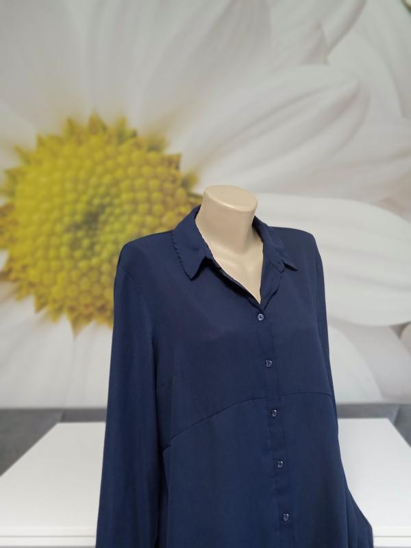 Интересная однотонная блузочка с длинным рукавом темно синего цвета. Легкая и удобная. Приятная на ощупь. Плотная плотная ткань. Практически не тянется. Ложится свободно. Фасон-легкая трапеция. На гудзичках. Удлиненная. Есть размеры. 50р на пог-54-56 48р на пог-52-54 Длина вперед 70см. По спинке 85см