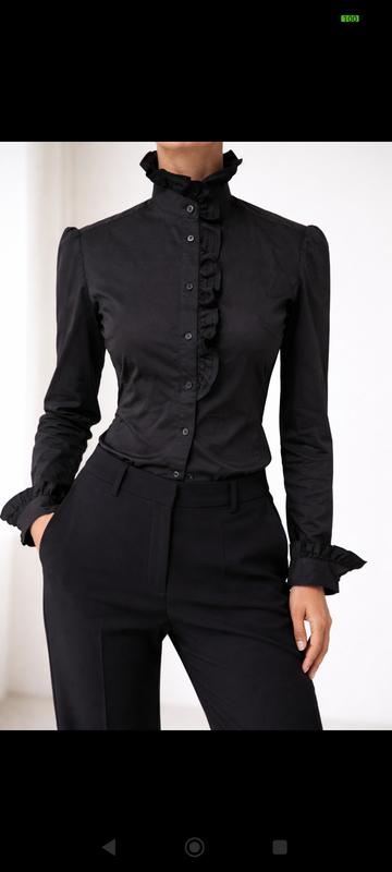 полу грудь 42 см, но в составе есть спандекс, поэтому ткань тянется и мягко ляжет по фигуре. длина изделия 58 см длина рукава 60-61 см Блуза приталенная, воротник стойка с маленькой рюшей, которая переходит на перед, на молочную. На манжетах также рюша, придающая блузе шарма. Рюша пролита декоративными швами, визуально можно подумать, что она идет в 3 яруса, хотя она одна (на фото это видно). Гудзики черные квадратные, самая нижняя пуговица пртшит нитью сиреневого цвета и петля для этого пуговица обметана яркой сиреневой нитью. Состав: 62 коттон, 33 нейлон, 5 спандекс. Ткань плотная и эластичная. Эффектов нет. есть запасная пуговица. Если же вопрос, буду рада ответить.