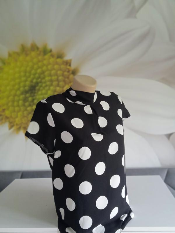 Классическая блузочка с коротким рукавом и оригинальным контрастным рисунком в горохи. Легкая и удобная. Приятная к телу. Плотная плотная ткань. Практически не тянется. Ложится свободно. Закрытая шея. По спинке завязки. Есть размеры. 38р на пог-48-50 36р на пог-46-48