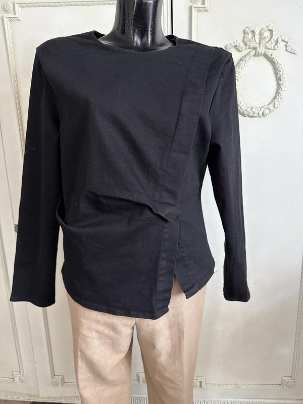 Колір чорний. Цікава асіметрияна модель із щільного полотна. Склад:котон/ліоцел/еластан(76/19/5). Заміри: довжина по спинці-59 см, ПОГ-50 см, ПОТ-45 см, ПОБ-50 см, рукав-62 см. Є підплечники.