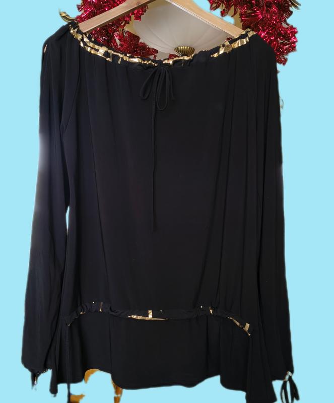 Черная блузка, туника с длинными рукавами, украшена золотистой отделкой по вырезу и по нижнему краю. Изделие выполнено из струящегося материала, имеет свободный крой с небольшим шнурком у горловины. Рукав от плеча-67:Пог-52:длина-67
