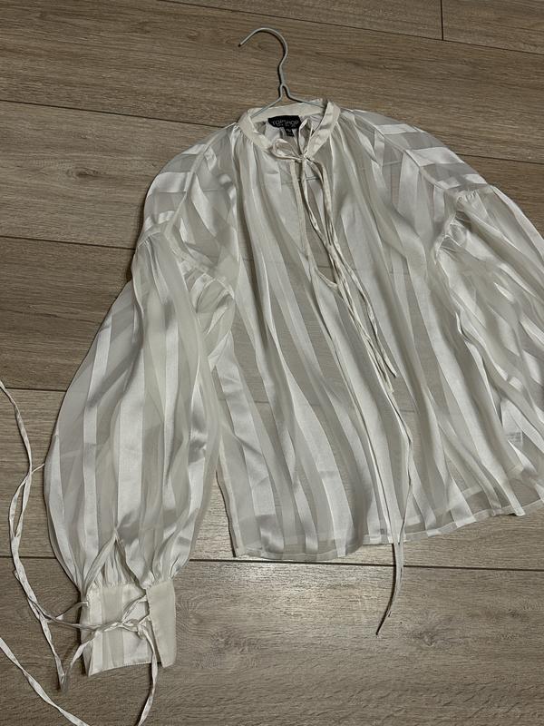 Неймовірно ніжна блуза, прям така святкова, круто підійде під брюки, спідницю, джинси. Манжети на шнурочках. Стан близький до ідеалу, місцями є маленькі затяжки, але в носці цього не помітно. Розмір s-m( маленька). Заміри: ог 57 см( але вона повинна бути вільна, тож груди орієнтовно до 100 краще) Довжина 61 см, рукав довжина від горловини 74 см.