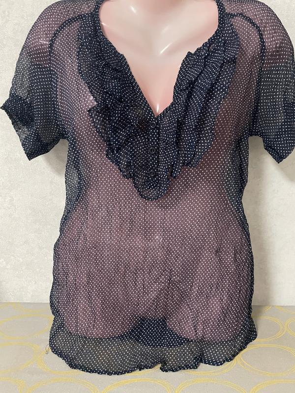 Легка напівпрозора блуза темно-синього (майже чорного) кольору в дрібний білий горошок. Тканина виглядає повітряною, шифон Деталі: • короткий рукав • глибокий V-подібний виріз • декоративні рюші вздовж вирізу • спереду маленькі ґудзики • низ хвилястий, з легкою зборкою Виглядає жіночно і ніжно, добре підійде під топ або майку, а також як легка літня блуза 👚